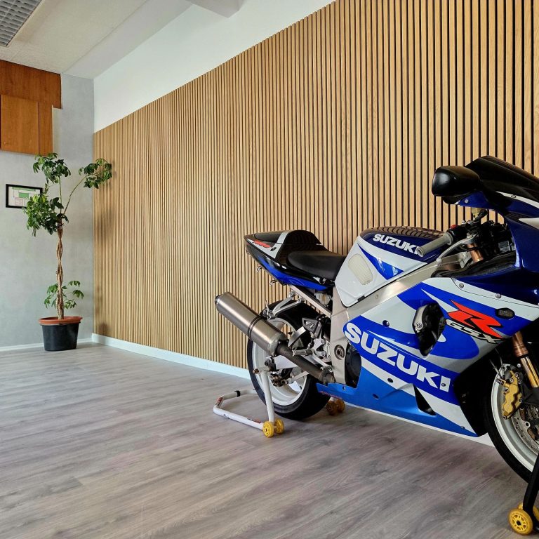 Für dieses Foyer ist von uns eine Wandöffnung mittels Holzständerwerk, Dämmstoffen und Trockenbauplatten verschlossen und mit modernen Akustikpanelen verkleidet worden. Als Bodenbelag haben wir Laminat vom Typ "Eiche hell" gewählt.